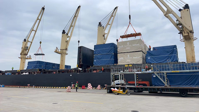 プレハブハウスを上海港まで大型トレーラーによる陸送し、当社が手配した貨物船に大型クレーンで積込を行い、モルディブ向けに海上輸送を実施。